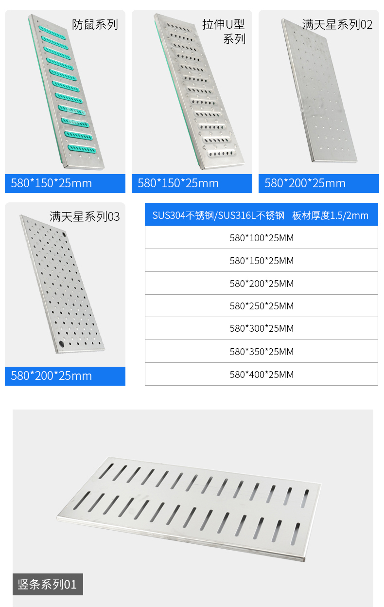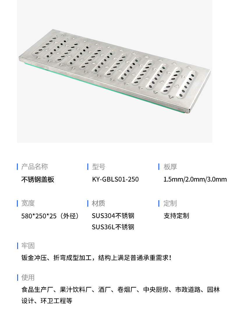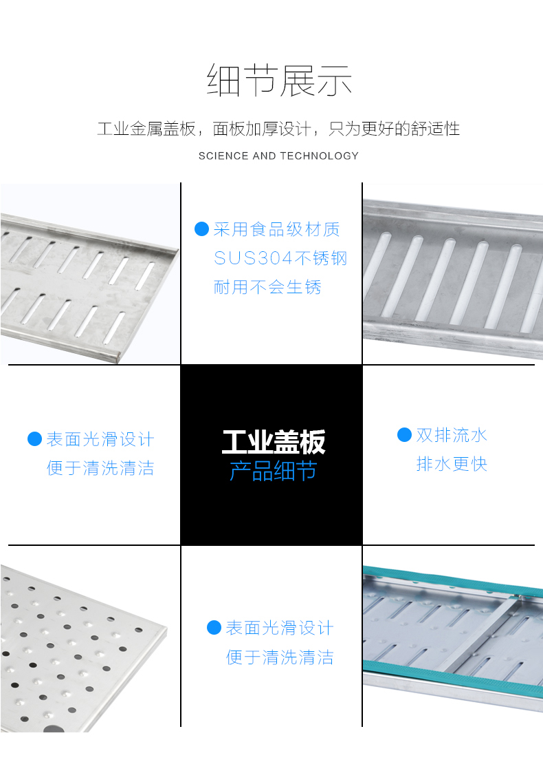 恳盈排水不锈钢盖板、不锈钢地篦子,具有抗腐蚀性能强、可抵抗酸和碱性能强、重量轻、承重能力强、防滑防鼠、易于安装、坚固耐用、通风良好、易于清洁且外形美观等特点,广受厨房、食品厂、酒水厂、制药厂、屠宰场、化工厂、商业建筑排水工程企业的好评。服务热线:400-1166-882 。