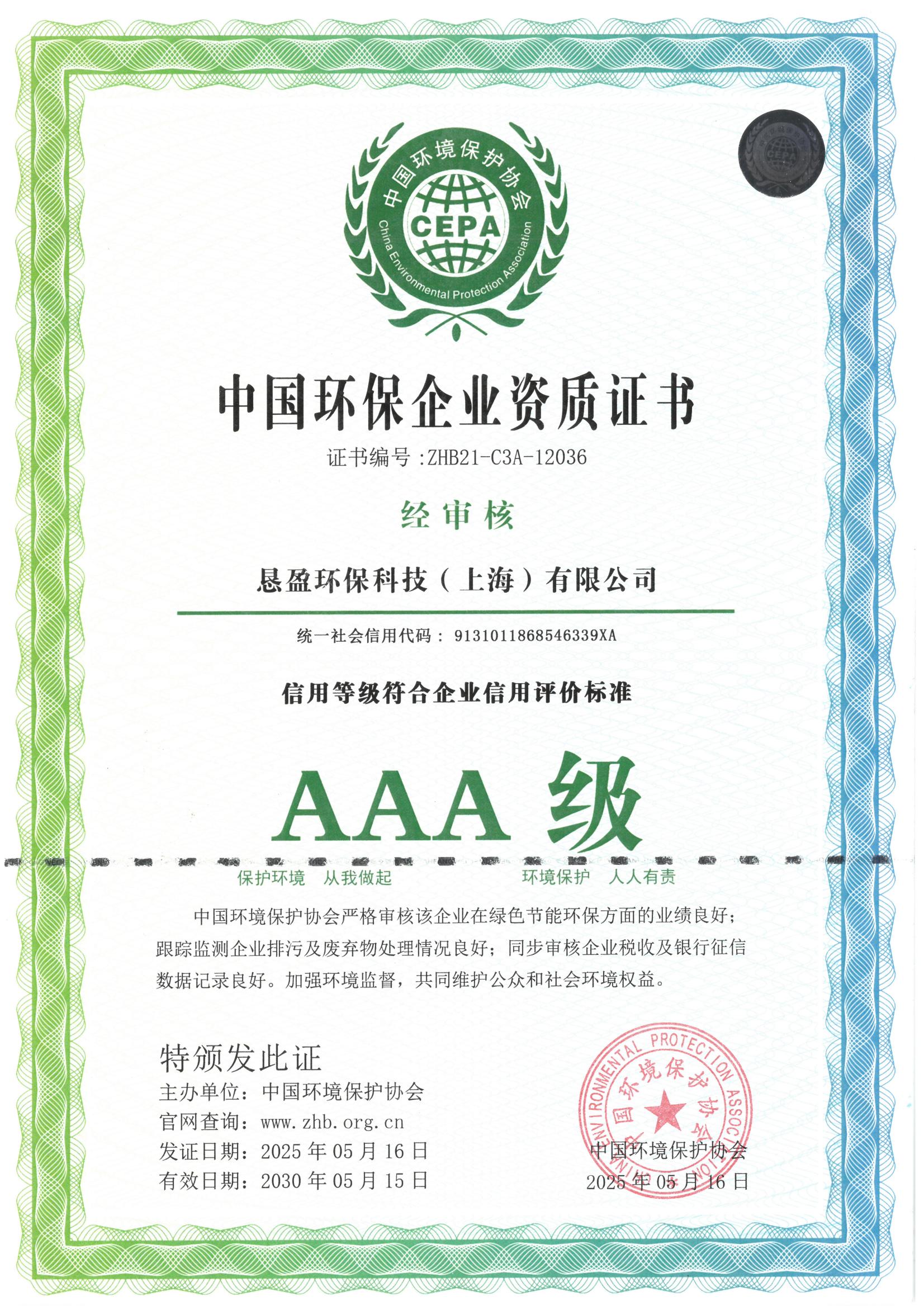 中国环境保护协会的认证,向来以审核严格、标准专业著称;AAA 级中国环保企业资质证书,从绿色节能、排污废弃物处理,到企业税收与银行征信,多维度验证恳盈经营规范、信用优良,是企业靠谱度的“硬背书”。